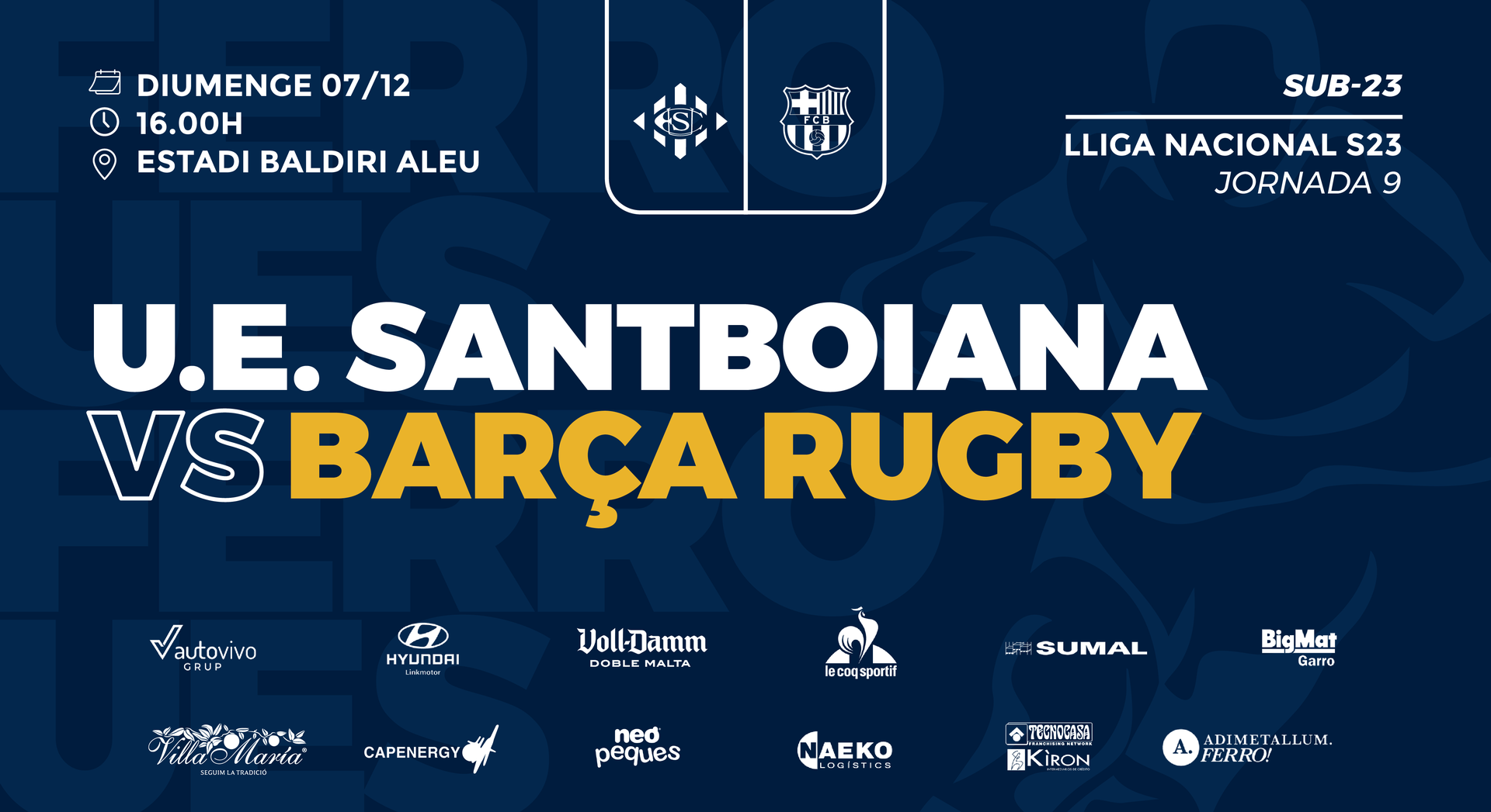 El conjunt Sub-23 de la U.E. Santboiana afronta aquest diumenge un dels duels més atractius i exigents de la temporada. El degà rep al Baldiri Aleu el Barça Rugby, segon classificat, en un Derbi Català que servirà per tancar la primera volta d’una manera especial: enfrontant els dos equips més sòlids del Grup B de la Lliga Nacional.