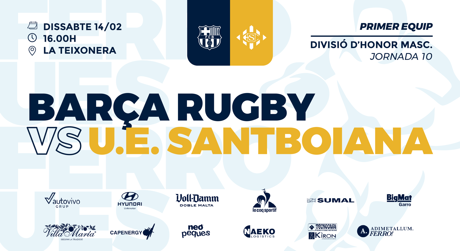 El Primer Equip Masculí de la U.E. Santboiana disputa aquest cap de setmana la desena jornada de la Divisió d’Honor amb una visita d’alt voltatge al camp del Barça Rugby, en un nou Derbi Català que es jugarà a la Teixonera.